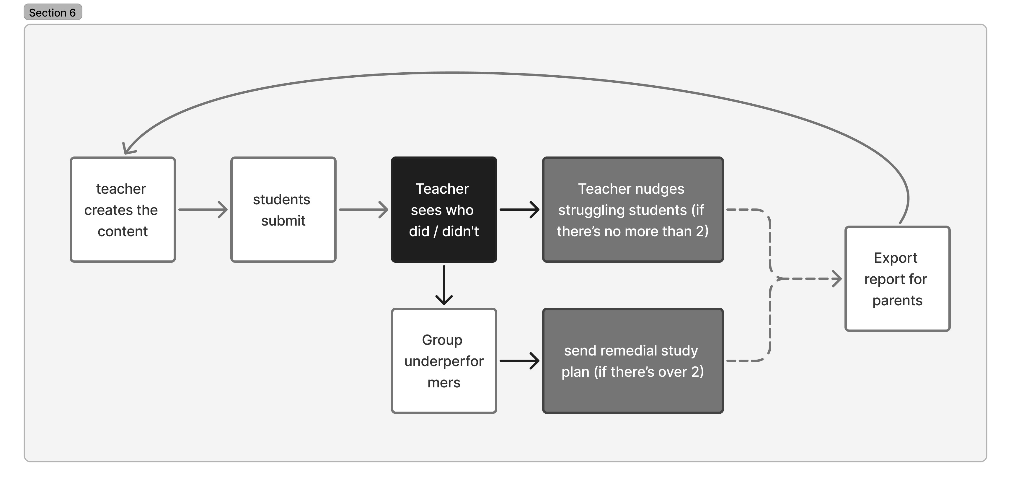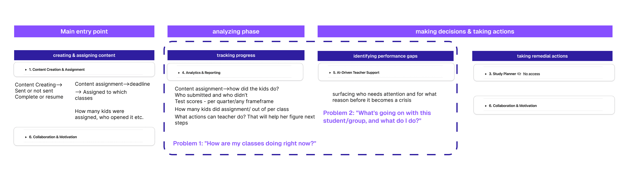 Based on 4 sample scenarios, what looked like a disconnected menu of features revealed a circular loop that occurs between analytics and action: a teacher creates content, assigns it, tracks progress, identifies gaps, and acts. That sequence became the spine.