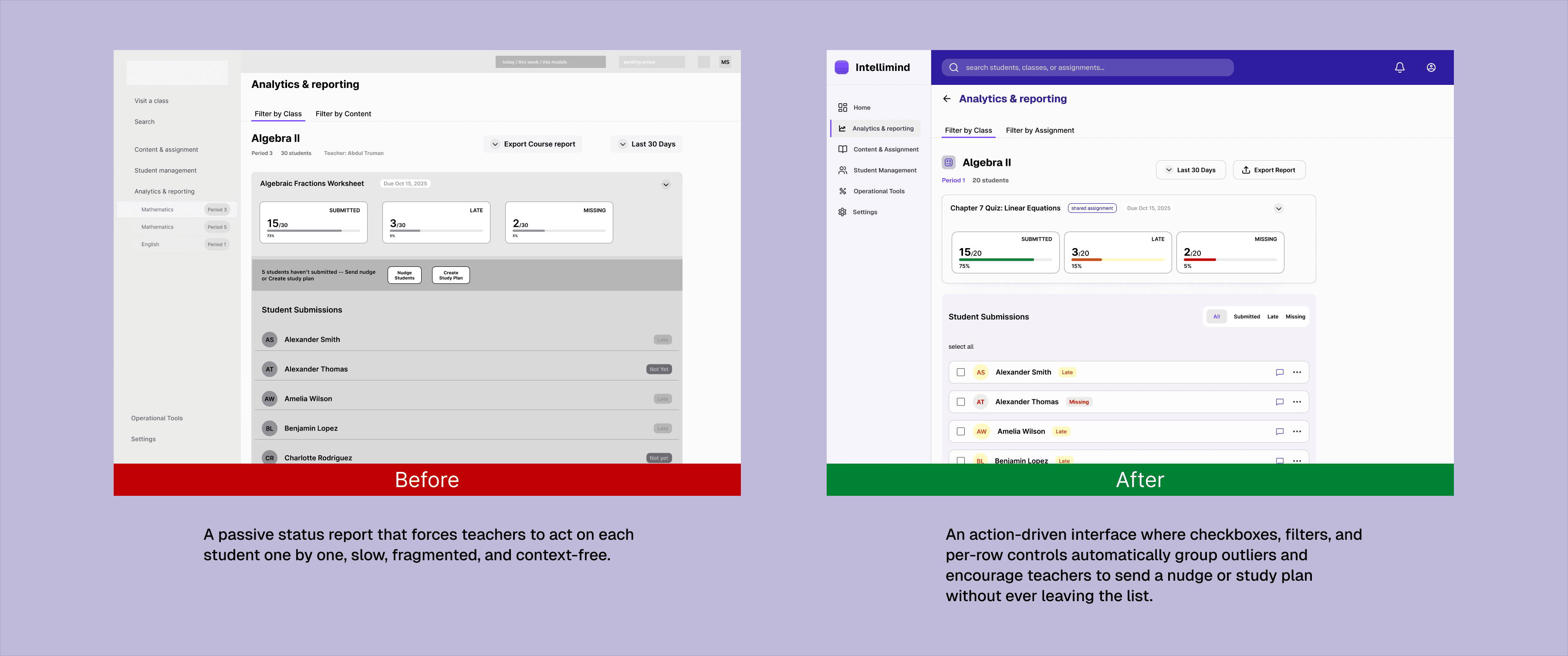 After: a decision-ready workspace that replace passive charts with categorized student performance, CTA buttons, AI-drafted nudges and suggested remedial work.