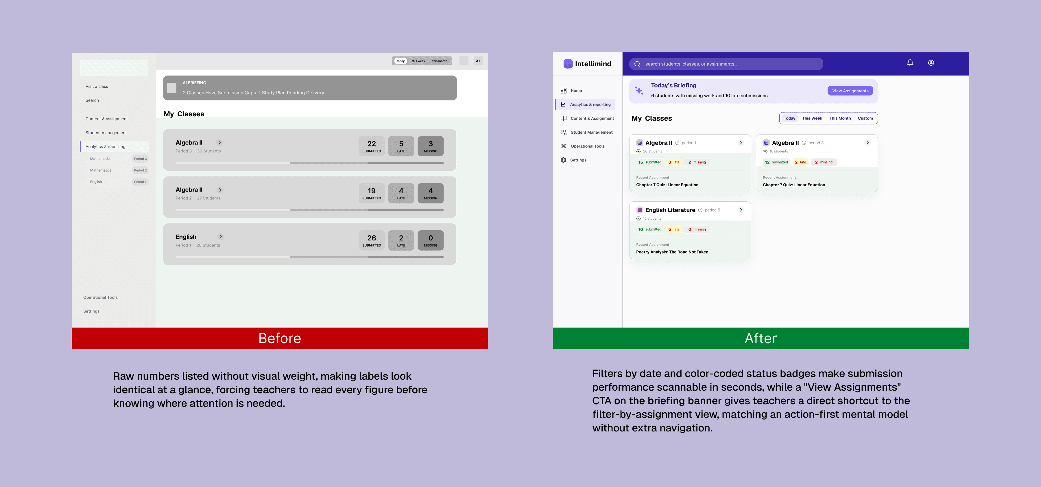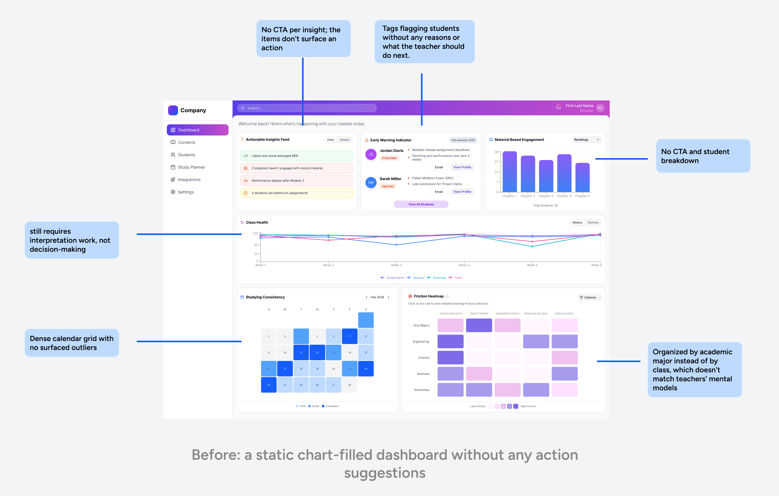 The gap crystallized when a teacher asked mid-interview: "What am I supposed to do after seeing this?" That question reframed the entire problem. Every feature had been designed as a data display, not a decision-making tool. I took that as the design problem to own independently after the project wrapped.