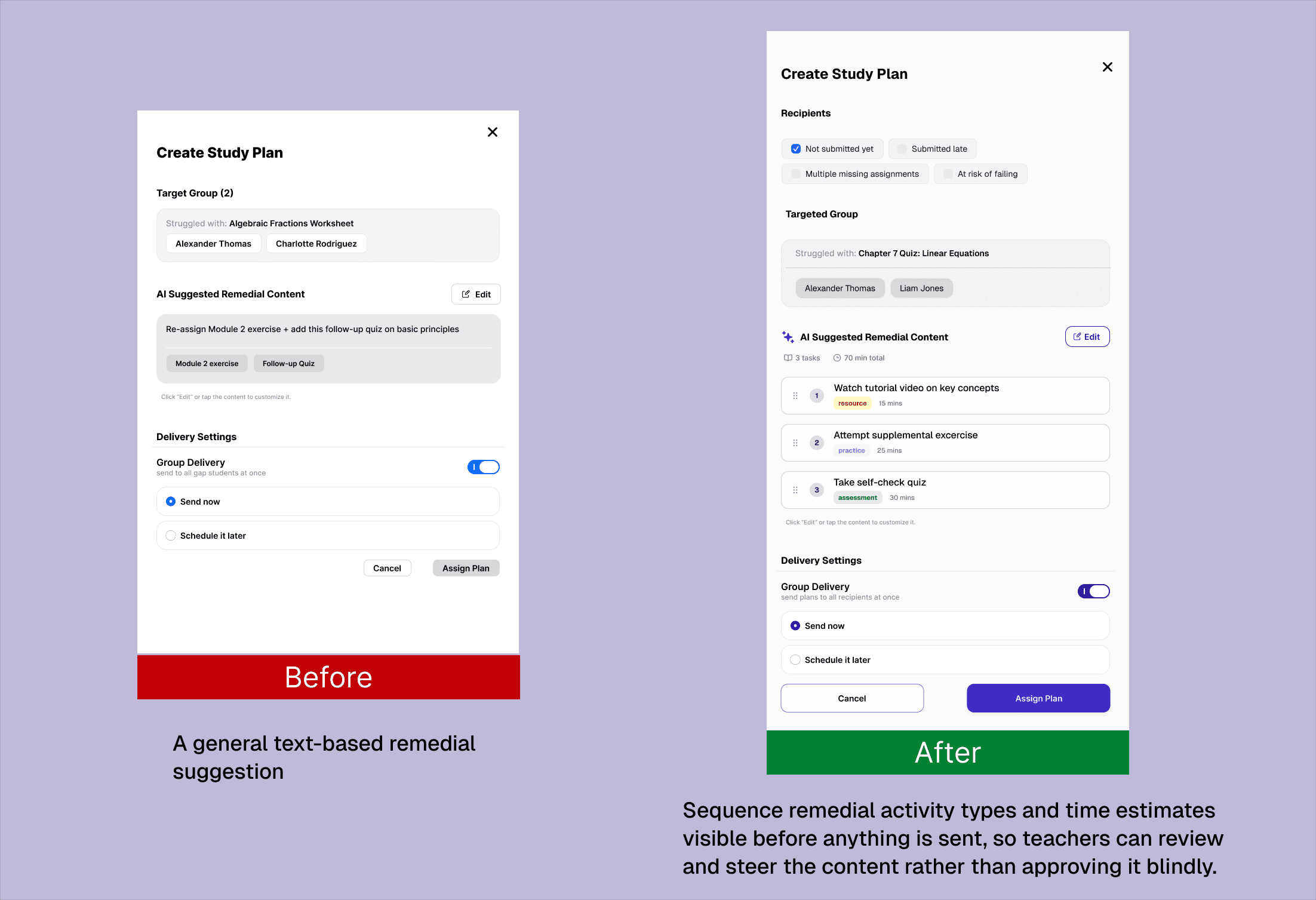 For the remedial work page, it evolves from generating a text-based remedial suggestion to sequencing activity types and time estimates visible before anything is sent, so teachers can review and steer the content rather than approving it blindly.